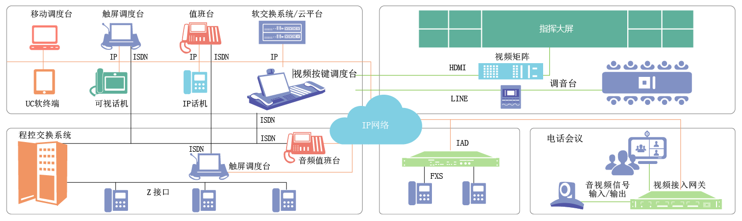 ● 形式多样。根据不同场景可灵活部署智能按键、液晶按键、触摸屏式按键等多种形式调度台,人机交互体验优良。